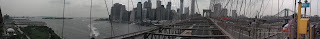 The route from Williamsburg to the Manhattan Bridge took us West along Kent past the Navy Yard until we could turn on Flushing Ave passing Steiner Studios, and eventually following signs to the entrance for the Manhattan Bridge. This bike path is a little narrow, and was made even more so by scaffolding erected for construction. This is another location where fence obscures part of the views. I was however able to place my camera on a rail and successfully take some panoramic pics with my Fuji camera here.